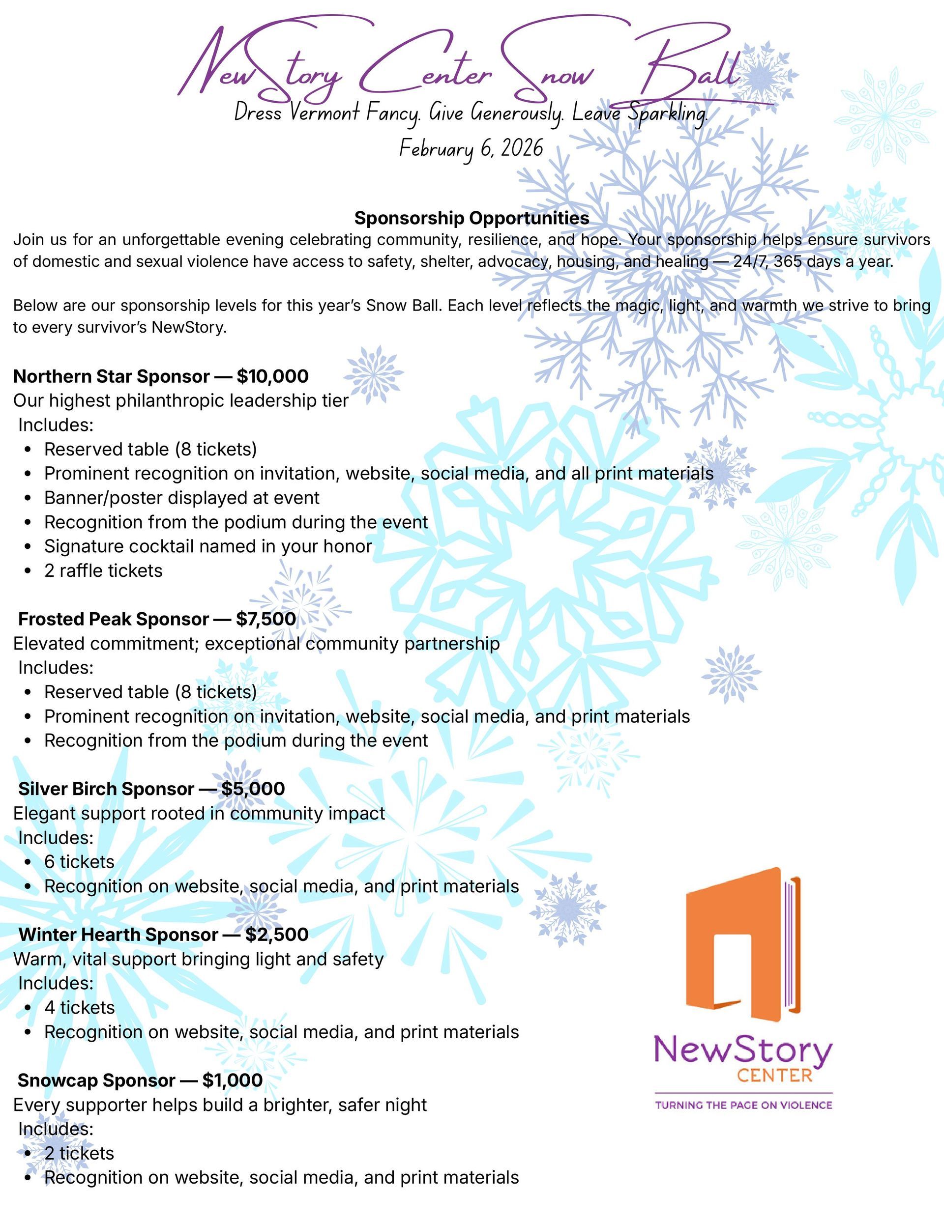 The NewStory Center Snow Ball will take place on Friday, February 6, 2026 at the Rutland Country Club, 275 Grove Street, Rutland, VT 05701